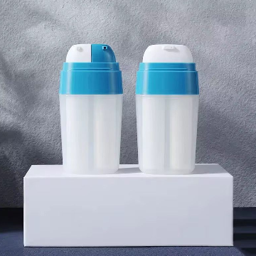 Premium dual-chamber airless PP cosmetic bottle designed for skincare products such as lotions, serums, and BB creams. The innovative 2-in-1 design keeps formulas separated for better protection and hygienic dispensing. Available in 10ml, 15ml, and 25ml sizes ideal for modern cosmetic packaging.